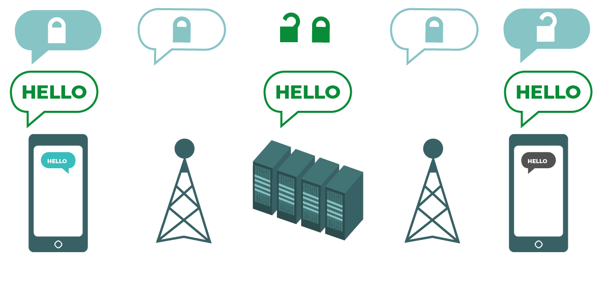 | แผนภาพแสดงการเข้ารหัสจากต้นทางถึงปลายทาง สมาร์ทโฟนทางด้านซ้ายส่งข้อความ “Hello” สีเขียวที่ไม่ได้มีการเข้ารหัส ข้อความดังกล่าวจะถูกเข้ารหัส จากนั้นจะถูกส่งต่อไปยังหอสัญญาณโทรศัพท์มือถือ และต่อไปยังเซิร์ฟเวอร์ของบริษัท ท้ายสุดสมาร์ทโฟนอีกเครื่องจะได้รับข้อความที่มีการเข้ารหัส แล้วถอดรหัสข้อความดังกล่าวเพื่อให้อ่านข้อความได้ว่า “Hello” การเข้ารหัสประเภทนี้ไม่เหมือนกับการเข้ารหัสในชั้นการขนส่ง โดยเซิร์ฟเวอร์ของ ISP ที่คุณใช้งานจะไม่สามารถถอดรหัสของข้อความได้ เฉพาะผู้รับปลายทางเท่านั้น (อุปกรณ์ต้นทางจะส่งและรับข้อความที่เข้ารหัส) ที่มีคีย์สำหรับปลดล็อกข้อความ |